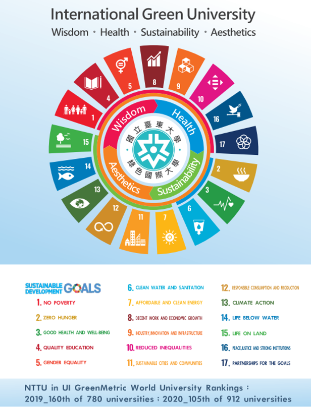 Universities are the base for cultivating talent in higher education. Universities also have the crucial mission of cultivating future citizens of the Earth and the obligation of educating and realizing sustainable development. In 1990, 20 university presidents and principals signed the Talloires Declaration in the international conference titled “The Role of Universities in Environmental Management and Sustainable Development” and unveiled the following action plans: (1) Raise awareness of the urgent need for an environmentally sustainable future; (2) encourage university culture in pursuit of a sustainable future; (3) cultivate environmentally literate and responsible citizens; (4) develop environmental literacy among university faculty members; (5) establish environmentally responsible university ecosystems; (6) encourage government–industry collaborations in environmentally sustainable development; (7) develop cross-domain exchange programs; (8) establish partnerships with primary and secondary schools; (9) strengthen national and international collaborations and services; and (10) continue the momentum for exchanges and support for implementing this declaration. The Talloires Declaration led to the rise of today’s global Green University movement. Particularly, University of Indonesia (UI) has launched UI GreenMetric World University Rankings since 2010. The rankings are based on the performance of sustainability in higher education institutions and allow comparisons between them. By 2020, 912 universities around the world have participated in the comparisons. Our institution promotes ourselves as a green university with "wisdom, health, sustainability, and aesthetics" as the connotation, and concretely implements SDGs. The Talloires Declaration led to the rise of today’s global Green University movement. Particularly, University of Indonesia (UI) has launched UI GreenMetric World University Rankings since 2010. The rankings are based on the performance of sustainability in higher education institutions and allow comparisons between them. By 2020, 912 universities around the world have participated in the comparisons. Our school promotes ourselves as a green university with "wisdom, health, sustainability, and aesthetics" as the connotation, and concretely implements SDGs. We aspire to influence individuals, families, schools, societies, countries, and even the whole world in their existence and lives through each university member’s sustainable development cultivation and actions.